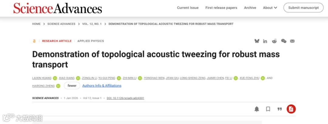 该体系的可扩展性与鲁棒性为在生物组织等复杂非均匀介质中维持稳定的操控力场提供了理论基础,也为从根本上解决声镊在复杂、非理想环境中精确稳定合成的难题提供了新范式,对光镊、拓扑物理等相关领域亦具有重要的借鉴意义。相关研究成果以“Demonstration of topological acoustic tweezing for robust mass transport”为题,于2026年1月1日发表在《Science Advances》上。