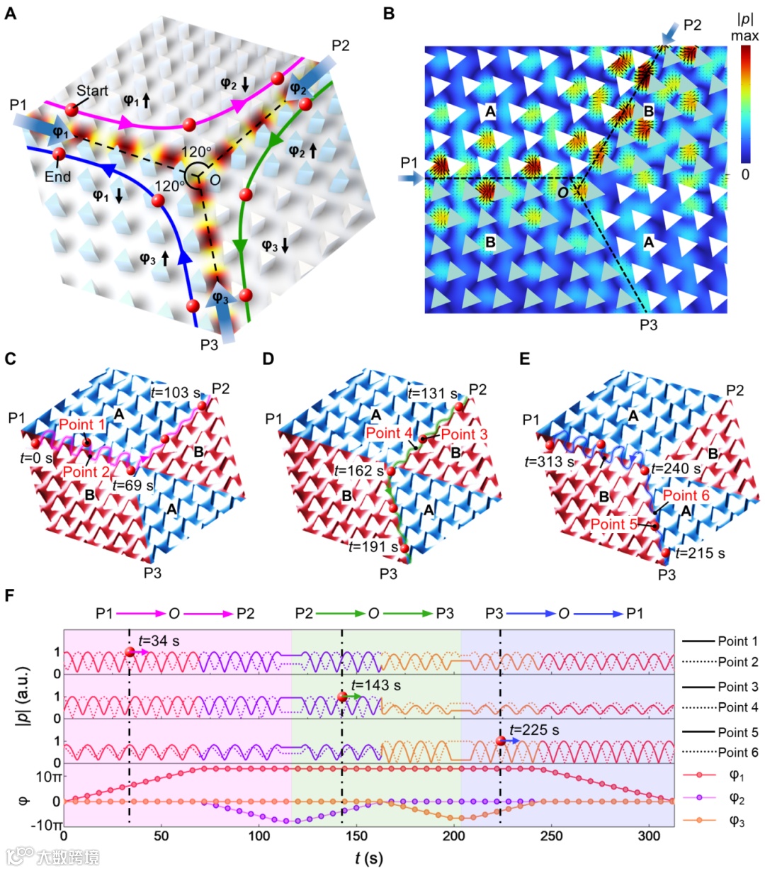 图4:拓扑质量循环。(A) 拓扑声学循环器示意图。(B) 声波从端口P1和P2入射时的仿真声压场分布。黑色箭头描绘了声辐射力的方向。(C)至(E)分别展示从端口P1到P2、从P2到P3、从P3到P1质量输运的实验结果。(F) 三个端口处声源相位的时序变化,以及在(C)至(E)中标记的六个点处计算得到的声压幅值