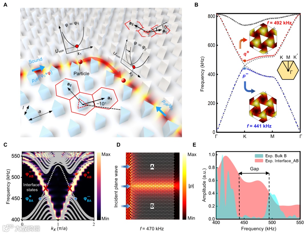 图1: 拓扑声学质量输运。(A) 利用谷霍尔拓扑绝缘体实现颗粒输运示意图。(B) 元胞能带结构。插图为两种谷态(q⁺和p⁻)的模拟本征场分布。(C) 超胞能带结构及通过傅里叶变换得到的相应频谱。(D) 在470 kHz频率下,谷霍尔拓扑绝缘体中的仿真声压场分布,平面波从左边界入射。(E) 晶格B和晶格A-B界面的实验测量透射谱。在带隙范围内(如黑色虚线标注)可观察到明显的拓扑波传输