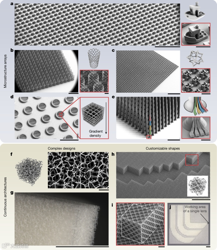 如果说图1验证的是系统的“基本功”,那么图2则全面展示了金属透镜并行光刻在真实复杂结构中的制造能力。研究团队首先打印了大量高度可复制的微结构阵列,例如包含悬垂和锐角细节的3DBenchy模型(图2a),结果显示每一个单元都能精准还原设计细节,几乎看不到传统拼接带来的误差。随后,系统被用于制造传统方法难以实现的大规模微粒阵列(图2b,c),在极短时间内完成了成万上亿级别的结构复制,充分体现了并行打印在“数量”上的优势。更重要的是,金属透镜TPL并不局限于孤立单元结构,在梯度密度泡沫、微针阵列以及连续晶格结构中(图2d–j),系统同样实现了厘米尺度的整体打印,而且拼接误差被控制在百纳米以内。这一结果表明,通过限制单个焦点的扫描范围并让阵列自动“对齐”,该方法从根本上消除了传统双光子光刻中最棘手的长程拼接问题。