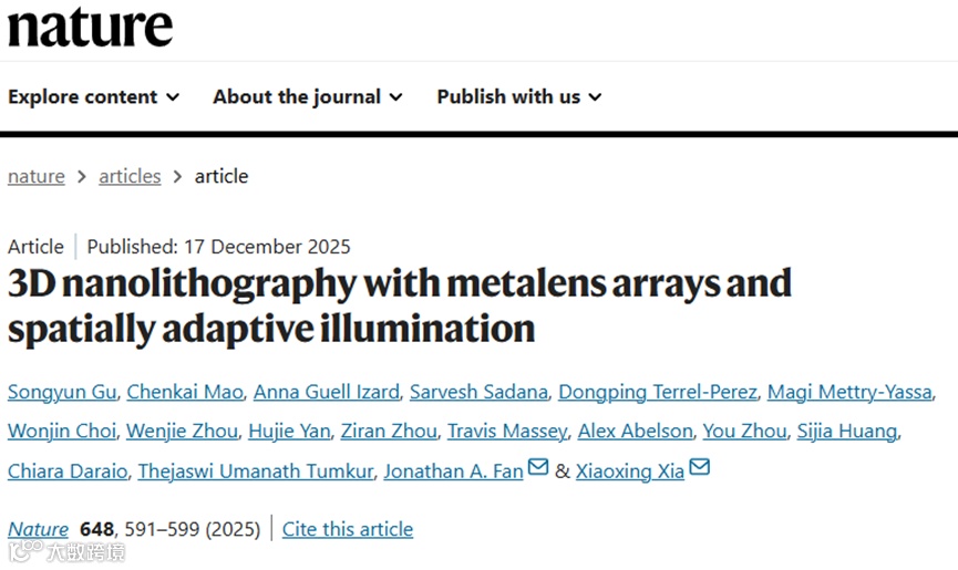 2025年12月17日,相关工作以“3D nanolithography with metalens arrays and spatially adaptive illumination”为题发表在Nature上。
