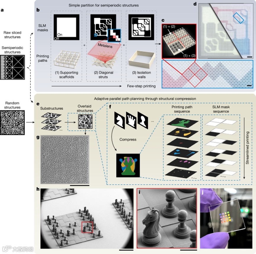 当结构不再是规则周期阵列时,并行打印往往会遇到效率骤降的问题。图3展示了研究团队提出的自适应并行光刻策略如何解决这一难题。对于具有层级或局部周期性的结构,系统可以通过结构分区的方式,分阶段激活不同的焦点组合完成打印(图3b–d),例如模拟生物血管网络的微流控通道,在保持复杂拓扑的同时仍能高效制造。而对于完全无周期的三维结构,进一步提出“结构压缩”的思路(图3e,f):先将整体结构拆分为与单个金属透镜视野匹配的子结构,再识别它们之间可以重叠并行打印的部分,从而大幅减少打印路径数量。通过这种方式,系统成功打印了随机Voronoi结构以及整套三维国际象棋开局阵列(图3g–j),证明即便是高度非周期的复杂几何,也能在并行体系下保持可控精度和可接受效率。