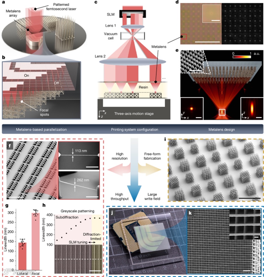 传统双光子光刻依赖单个显微物镜逐点扫描,而研究团队在这里彻底改变了这一模式:他们用大面积金属透镜阵列同时生成成千上万个高数值孔径的聚焦光斑(图1a,b),相当于把“一个物镜”变成了“一个物镜矩阵”。为了让这些光斑不仅数量多,而且彼此可控,系统中引入了空间光调制器(SLM)(图1c),能够对每一个焦点进行独立的开关和灰度调制,从而实现真正意义上的并行、可编程打印。图1d,e展示了金属透镜的实际结构与聚焦性能,其亚微米级的衍射极限聚焦能力保证了打印分辨率不会因并行化而牺牲。在此基础上,研究者通过精细调节激光强度,实现了从亚衍射到衍射极限的连续线宽控制,最细结构仅113 nm,且不同透镜打印出的线条高度一致(图1f–h)。这种稳定性为大规模并行奠定了基础。最终,系统在极短时间内完成了英寸级复杂三维结构的打印(图1i–k),直观展示了这种新型架构在速度和尺度上的颠覆性优势。