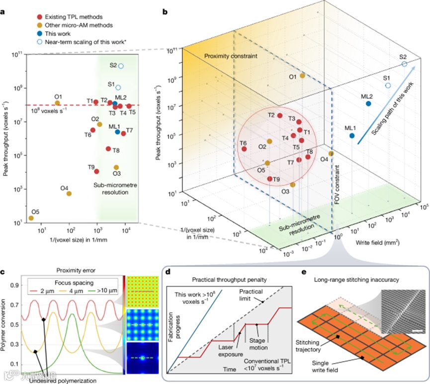 在最后,从宏观视角对比了不同3D微纳制造技术在分辨率、吞吐量和写入面积三者之间的关系。结果清楚地表明,传统双光子光刻始终受制于显微物镜视场与邻近效应的双重限制,而金属透镜并行TPL通过“非成像光学”的思路,从物理层面绕开了这两个瓶颈。当前系统已在12 cm²面积内实现超过 108 voxels·s⁻¹ 的打印速率,论文进一步指出,随着更大尺寸金属透镜阵列、更高速SLM以及更高重复频率飞秒激光的引入,该技术在不久的将来有望迈向 1010voxels·s⁻¹,为晶圆级三维纳米制造提供现实可行的技术路线。