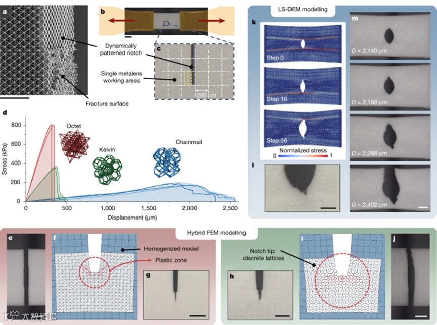 借助金属透镜并行光刻,首次在厘米尺度上系统制备了多种不同拓扑的机械超材料,包括典型的八面体晶格、Kelvin晶格以及具有互锁结构的“链甲”晶格(图4a–c)。在拉伸实验中,这些结构展现出截然不同的断裂行为(图4d):八面体和Kelvin晶格在应力集中后迅速脆性断裂,而链甲结构则能够通过单元间的相对滑移和重排,将裂纹扩展过程显著拉长,表现出极高的断裂韧性。结合原位实验与数值模拟(图4e–m),清楚地揭示了应力如何在链甲结构中被重新分配,这种“宏观可观察”的断裂机制,正是过去受限于制造尺度而难以系统研究的问题。