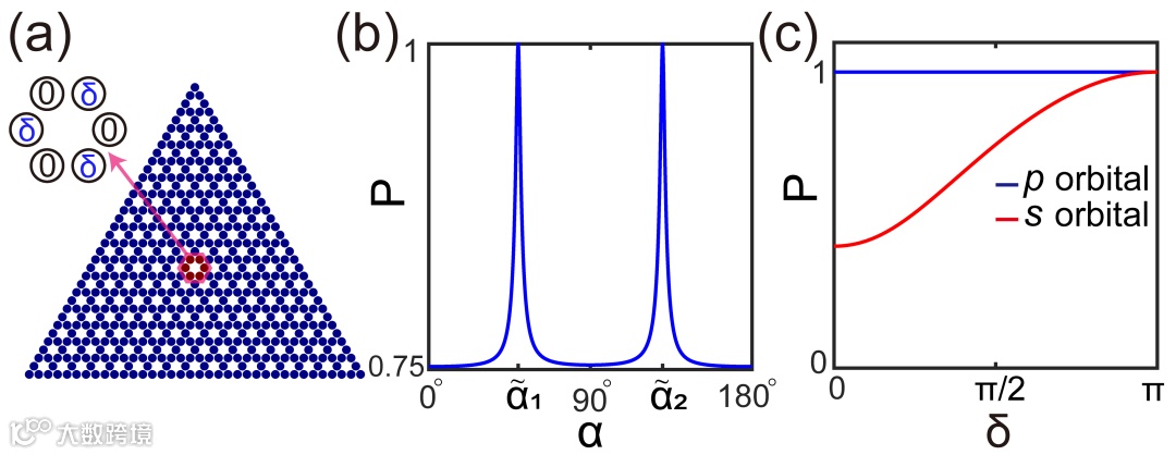图 2| 任意激发源下的局域态激发. (a) 激发源设置示意图,由六个幅值相同但相邻相位差异δ的位点组成。(b) 激发场的局域度随旋转角度的变化曲线。(c) p轨道和s轨道下激发场局域度随源相位参数δ的变化曲线。