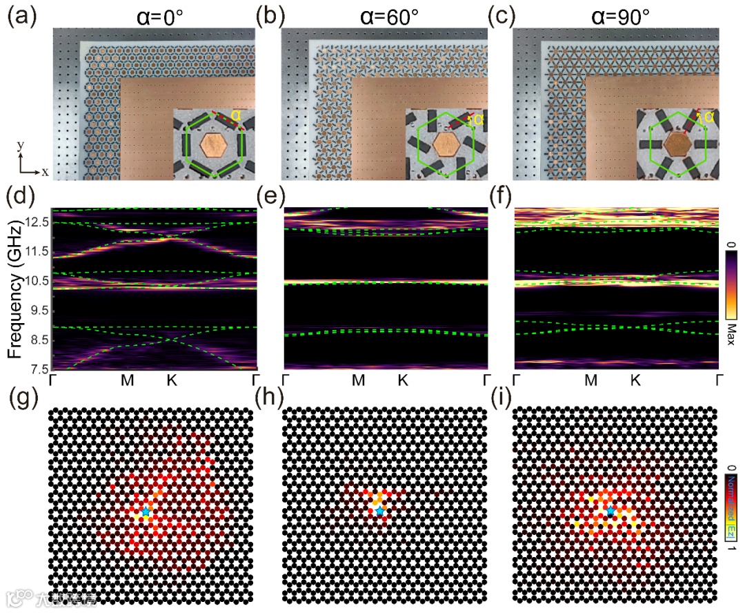 图4| 光子平带的实验观测. (a-c) 分别对应旋转角α = 0°、60°与90°的样品实物图。(d-f) 不同旋转角度下二维光子晶体的能带结构测量结果与模拟结果对比。(g-i) 三种样品在10.55 GHz频率下测得的电场分布图。
