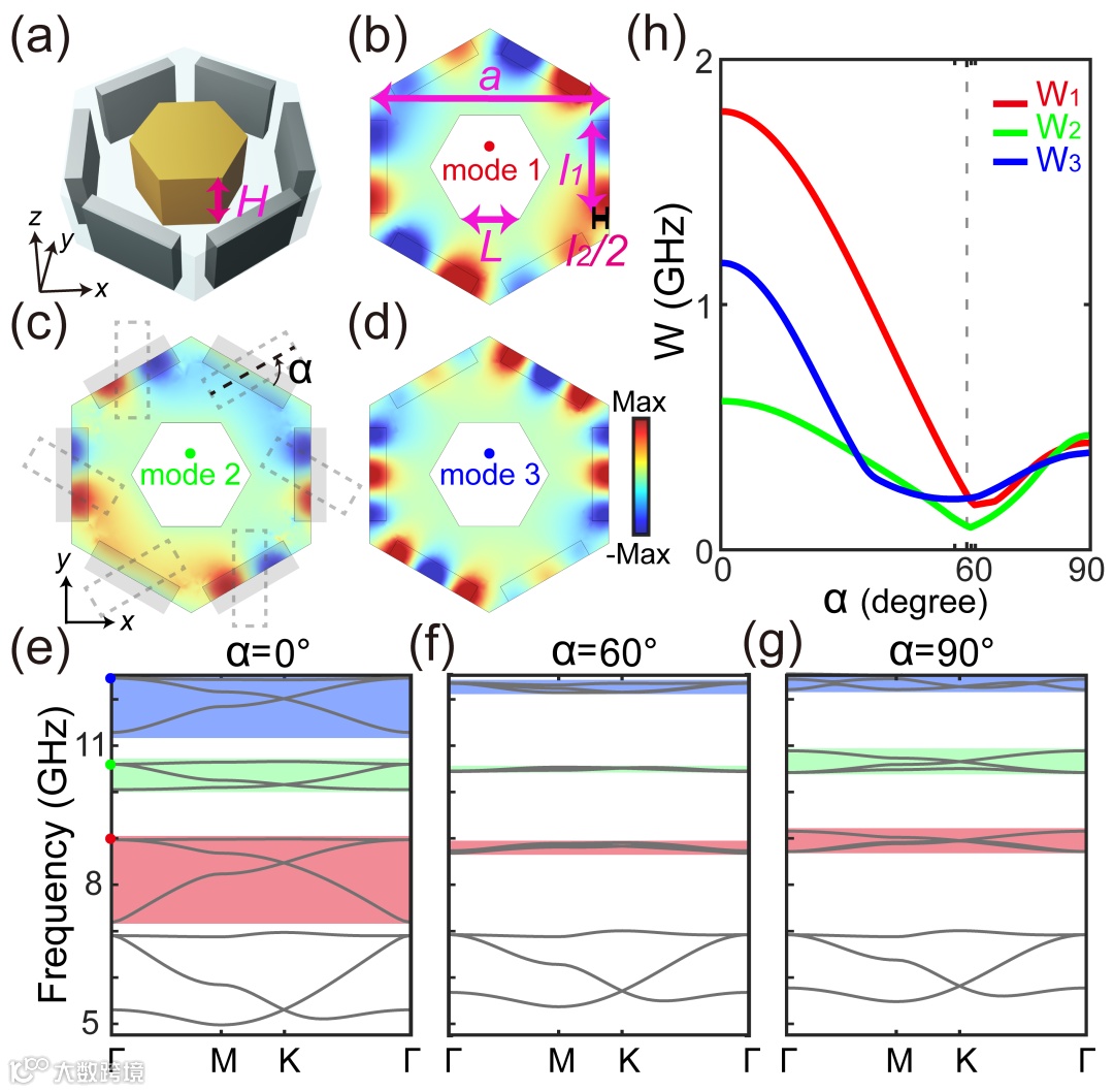 图 3| 在光子晶体中实现偶极Kagome晶格. (a) 旋转角为0°时的原胞结构示意图。(b-d) 三组能带的典型模态分布(以α = 0°为例)。前两个模态为偶极子模式,第三个为高阶模态。(e–g) 分别对应0°、60°和90°三种典型旋转角下的能带结构。(h) 各组能带全局带宽W的变化规律,其最小值出现在60°附近。