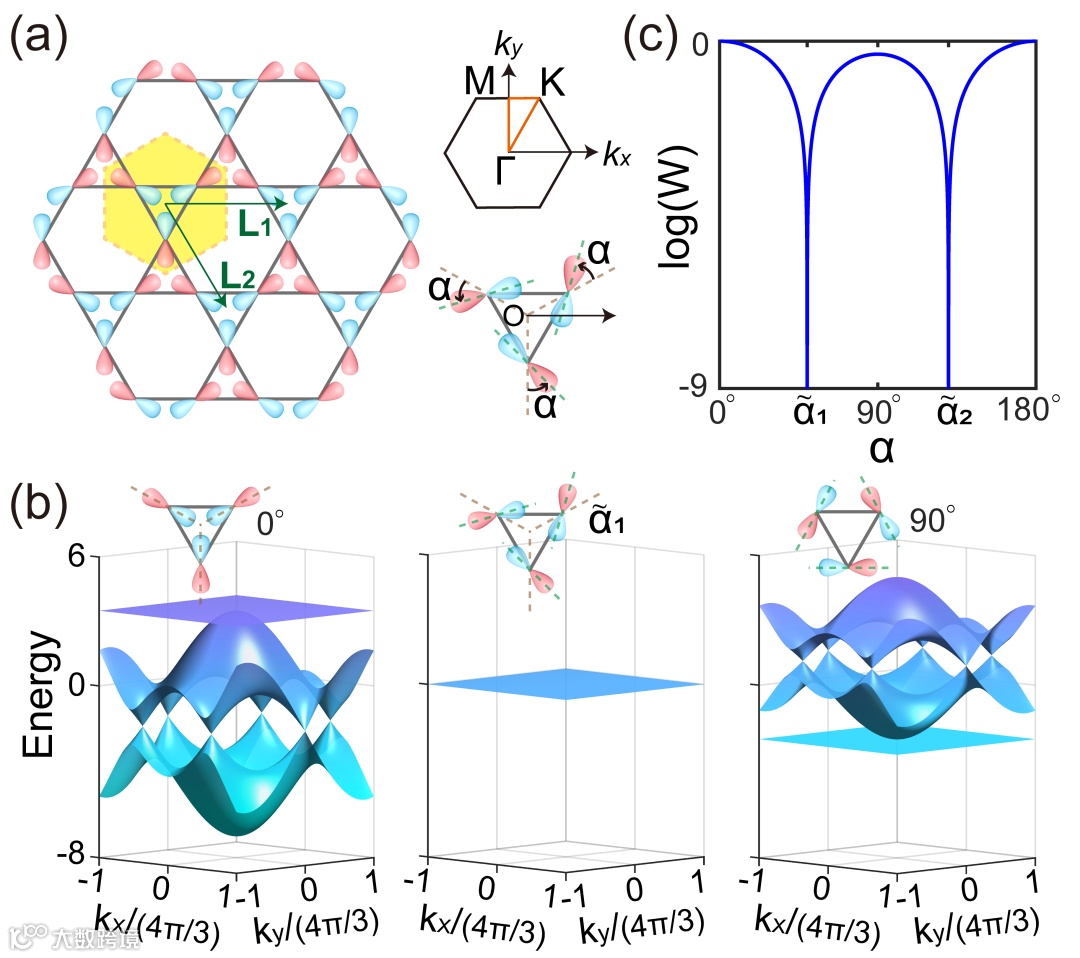 图1| 偶极子Kagome晶格的紧束缚计算. (a) 晶格结构示意图,3个p轨道同时旋转α角度。(b)α = 0°、49.8°、90°时的能带结构。(c) 三条能带总带宽W随旋转角度α的变化图。