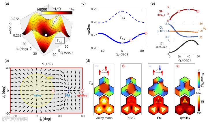 进一步地,我们系统研究了二维参数空间(δT,δB)中双简并本征模式的演化。超晶胞的C3对称性允许上述双简并态通过线性组合构建二重简并的赝自旋态,由此可以得到携带近场涡旋的Bloch模式。我们发现,在二维参数空间的高对称线上,近场Bloch模式的相位涡旋会随着δB发生对称移动,并在临界角度(~40°)发生融合,形成“两上一下”或”两下一上”的赝自旋纹理,类似于磁性体系中的几何阻挫,我们称之为光子阻挫模式(Frustrated modes)(图3)。光子阻挫模式本质上是镜像对称性匹配和临界谷模耦合的结果,对应参数空间中最低的辐射损耗。通过连续的改变δB,可以实现从倏逝的谷模到准BICs、阻挫模式和准谷模的转变,每个阶段表现出不同的近场涡旋分布、非线性重叠因子β和品质因子Q,揭示了定制光与物质相互作用的不同阶段。值得注意的是,阻挫模式的非对称涡旋配置带来了优化的Qβ因子以显著地增强二次谐波(SH)。