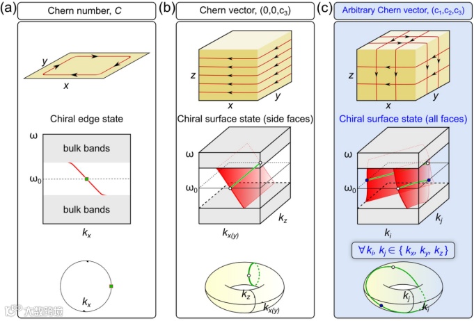 图1. 具有不同拓扑不变量的二维(三维)陈绝缘体手性边界态(表面态)的拓扑特性示意图。(a) 具有非零陈数C的二维陈绝缘体及其手性边界态;(b) 仅含1个非零陈矢量分量【C=(0,0,c3)】的三维陈绝缘体及其侧面上传输的手性表面态;(c) 具有多个非零分量陈矢量【C=(c1,c2,c3)】的三维陈绝缘体,其所有表面上都支持手性表面态。
