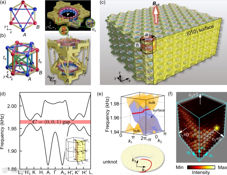 图2. 陈矢量为C=(0,0,1)的三维声学陈绝缘体。(a) 二维Haldane模型及其对应的声学结构,以及(b)其三维拓展;红色和蓝色箭头分别代表环形气流的方向;(c) 所构造的三维声学陈绝缘体示意图。(d) 体能带;(e)