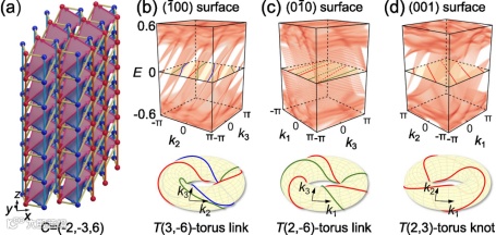 的缩放,使得选取的超胞为新结构的最小单元。图4(a)展示的是2×3×6大小的实例,通过Wilson Loop计算可知其陈矢量为C=(-2,-3,6),与前述预示的结果一致。此陈矢量的每个分量绝对值都大于1,因此其表面态色散呈现出多模态的特点,如图4(b-d)所示。虽然表面态色散看似复杂,但与前述情况相同,费米环(等频线)在布里渊区环面上缠绕的特性仍与陈矢量紧密相关。仍以