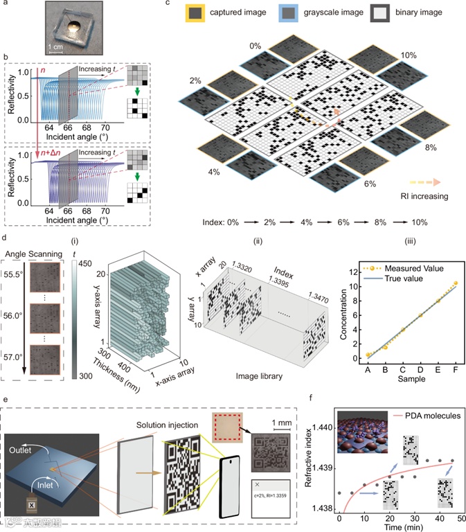 如图3所示,为验证该厚度-折射率映射关系,团队结合微流芯片技术,制造了一个具有二维码状像素块的厚度调制波导层。其中,每个像素块的厚度通过灰度电子束光刻进行调控。外界折射率变化时,会激发“二维码”不同位置处的导模共振,通过监测该二维码图案变化,可以有效地解码周围环境的折射率。这种二维码的变化也可以用于光学加密应用,折射率或浓度信息可以被编码到像素化的厚度调制波导层。只有当注入特定溶液时,才会出现二维码信息,通过扫描此二维码,可以解码加密的折射率和浓度信息,如图3e所示。通过像素化二值图像传感平台,有望实现折射率的盲读功能,不需要用标准溶液进行校准。