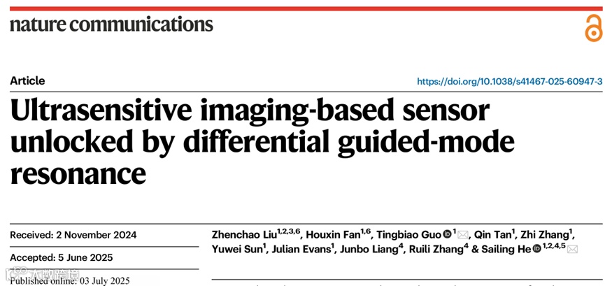 近日,浙江大学光电学院何赛灵课题组在《Nature Communications》期刊在线发表了题为《Ultrasensitive Imaging-based Sensor Unlocked by Differential Guided-Mode Resonance》的研究论文。该研究创新地引入“差分导模共振”(differential guided-mode resonance, dGMR)机制,通过在波导层内精准调控十纳米级厚度差,构建出对折射率变化极度敏感的差分导模共振传感结构(图1)。该结构实现了高达990000 pixels/RIU的成像灵敏度,在中等 Q 因子(≈100)条件下获得了104 RIU⁻¹的品质因数(FOM),有效降低了传统谐振传感器对高Q值的依赖。此外,该方案兼具免光刻大面积制备的工艺优势,并开发了便携式检测原型,展现出在生化分析、蛋白检测和环境监测等领域的广泛应用前景。