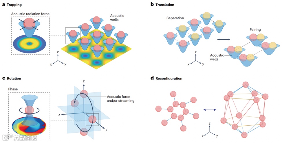 图4. 声镊应用示意图。a,在声阱中实现对单个目标的声学捕获。捕获位置依赖于目标的物理属性,如尺寸、密度与可压缩性。插图展示了单个声阱的声场分布及声辐射力的方向。b,同时并行平移多个目标对象。运动路径可通过预设的声场相位图案规划,或通过移动声场实现动态引导。c,对捕获目标进行平面内与垂直平面的旋转操控。通常以声波传播方向所在的x–y面作为参考平面。d,声场结构与目标图案的重构。通过调控声场分布,可实现目标位置的连续可控切换与图案重新排列。