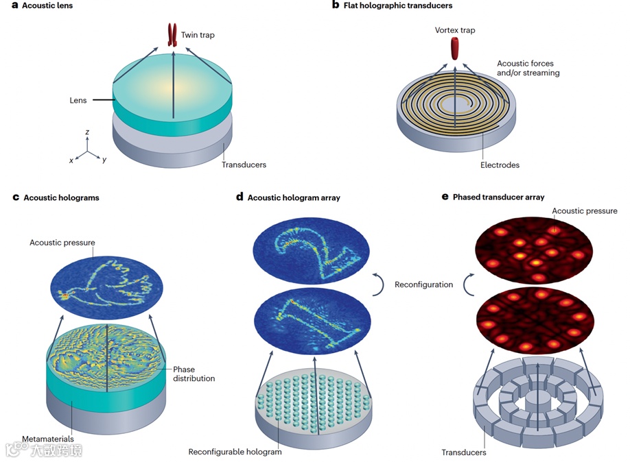 图3. 三维聚焦型声镊。a,最基本的三维声束生成方式由换能器与声学透镜组合构成,透镜可通过多种技术制备,包括超材料设计。b,采用螺旋图案电极构建的三维声镊器件,可形成具有方向性的聚焦声场。c,利用声全息板通过三维波束整形生成静态二维图案,实现场形可控。d,可重构的全息板使声场能够在二维与三维结构间灵活切换,实现动态场调控。e,二维相控阵列可生成并实时操控三维声场。