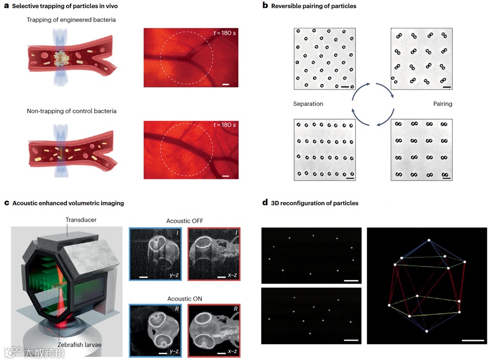 图5. 声镊在典型应用中的实验结果展示。a,声镊可在多种环境中(如微流控芯片、培养皿以及活体血管内)捕获生物成分,包括细胞与细菌。b,声镊可用于对颗粒或细胞对进行平移操控,实现精确控制的成对运动。c,声镊可实现对模型动物如斑马鱼幼体的旋转操作,显著提升三维体积成像质量。右侧小图为体积OCT扫描的选定切片图(l)及其反射信号图像(R)。d,实现对颗粒的三维重构声阱捕获,并可灵活重构声场结构。