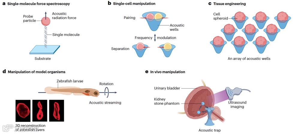 图6. 声镊在精准生物学与医学中的典型应用。a,声镊可用于捕获单个颗粒并牵引单分子,用于开展力谱研究。b,该技术支持细胞对的可逆配对与分离,适用于细胞间相互作用研究。c,声镊可引导单细胞组装成类似组织的结构,为组织工程提供新手段。d,已应用于模型生物如斑马鱼幼体的操控,支持其空间定位与行为干预。e,可在猪膀胱体内实现毫米级颗粒的操控,展示其在活体环境中的应用潜力。