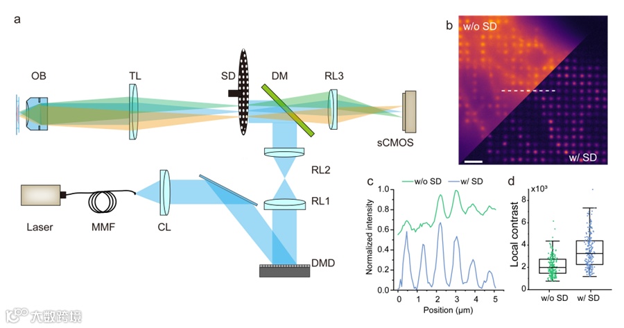 图1: C²SD-ISM光路图(a),以及转盘的引入对多焦点图像光斑可见度的提升(b-d)。