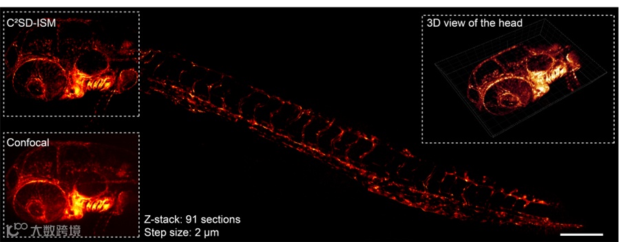 研究团队对EGFP标记的斑马鱼血管系统进行体积拼接成像(2.91 mm × 1.26 mm × 0.18 mm)。与传统共聚焦成像相比,C²SD-ISM显著提升了分辨率,揭示了许多在共聚焦图像中难以辨别的精细血管结构,并呈现出更为清晰的血管形态(图4)。
