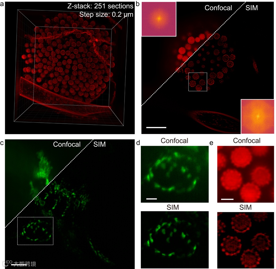 图5:C²SD-ISM系统在SIM模态下,对霉菌样本和EGFP标记的斑马鱼心外膜组织的成像结果。