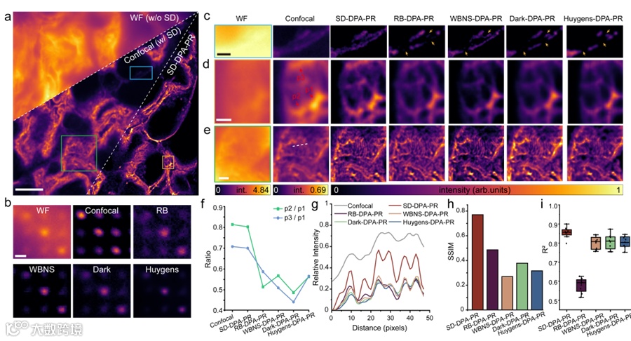 图3:基于转盘去离焦(SD-DPA-PR)和基于计算去背景方法(RB\WBNS\Dark\Huygens-DPA-PR),对超分辨重建结果的影响。