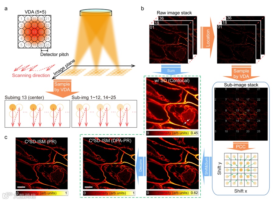 图2: (a) 虚拟探测器阵列的构建及采样示意图。(b) DPA-PR 重建流程示意图。(c) 同一区域的PR重建结果。比例尺:5 μm。