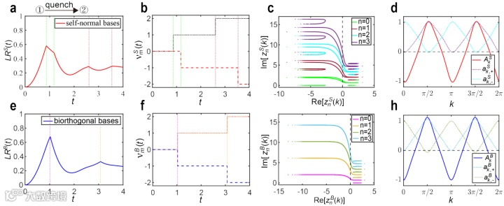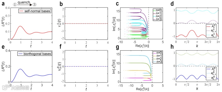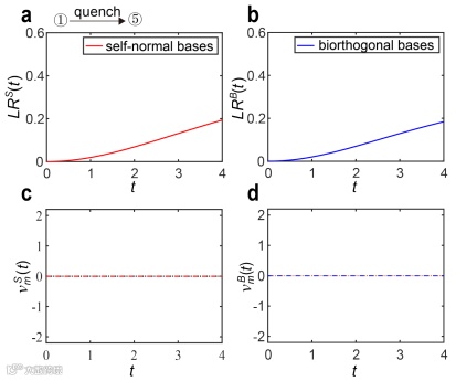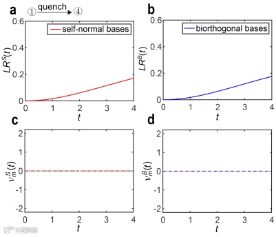 随后,在PT对称破缺区域,通过不同拓扑相(图3)和相同拓扑相(图4)之间淬火动力学演化过程,观测到两种DQPTs均没有发生。进一步分析自正交基和双正交基下的动力学不动点,发现在PT对称破缺区域动力学不动点存在消失的现象。