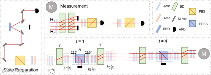 图5. 在一维离散时间量子行走中观测自正交和双正交动力学量子相变的实验装置