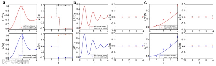 图6. 不同淬火过程中自正交和双正交的动力学量子相变的实验结果。(a) PT对称保持区域,不同拓扑相之间淬火演化;(b) PT对称保持区域,相同拓扑相之间淬火演化;(c) PT对称破缺区域,不同拓扑相之间淬火演化