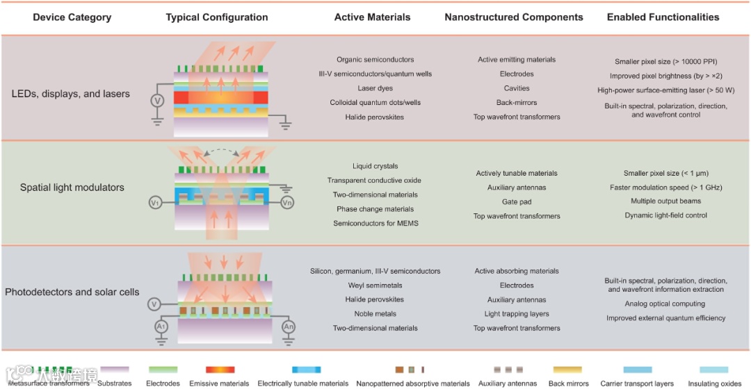 超构材料是一种由人工微结构定义其性能的新型材料体系,而超构表面是其二维形式,可以精确控制光波的相位、振幅和偏振特性。最初,超构表面主要用于光波前的被动调控,如透镜和偏振片等。随着纳米制造技术的发展,超构表面逐渐能够与传统光电器件结合,实现光的动态调制,如增强发光效率、提高光探测灵敏度、优化光束方向等。这种“光电协同设计”的方法,正成为下一代超紧凑、高性能光电子系统的关键。