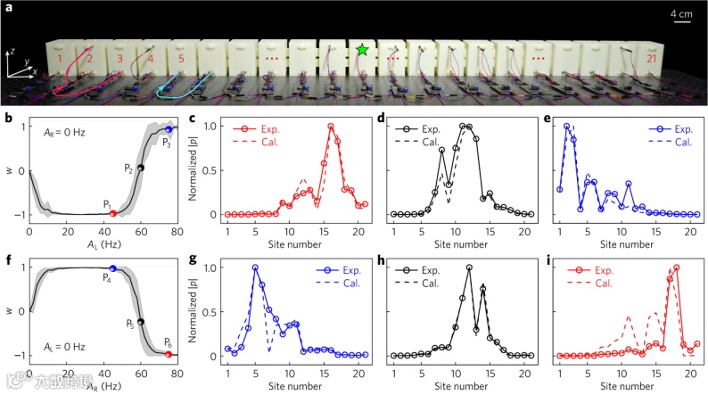 图2 (a)一维无序声子晶体示意图,红色和青色线分别表示实现向左的最近邻正耦合和负耦合的装置,绿色五角星表示声源位置。(b)数值计算AR=0 Hz对应的一维无序声子晶体的缠绕数。P1, P2和P3点分别对应AL=45 Hz, 60 Hz和75 Hz。(c-e)实验测量和数值计算(c)P1,(d)P2和(e)P3点对应的声子晶体中的声压幅值场分布。(f)数值计算AL=0 Hz对应的一维无序声子晶体的缠绕数。P4,P5和P6点分别对应AR=45 Hz, 60 Hz和75 Hz。(g-i)实验测量和数值计算(g)P4,(h)P5和(i)P6点对应的声子晶体中的声压幅值场分布。计算图(b)和(f)时,取N=2001,忽略固有损耗,计算结果对50个无序组合取平均,灰色阴影区域表示缠绕数的标准差。