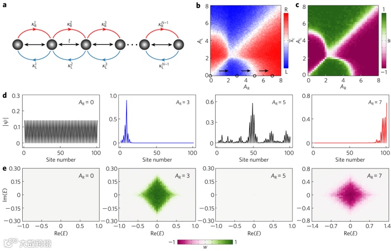 图1 (a)一维无序晶格模型示意图。(b)数值计算零能本征态的平均位置,晶格尺寸和互易耦合分别为N=101和t=1,计算结果对100个无序组合取平均。(c)数值计算AL和AR取不同值对应的缠绕数,N=2001,计算结果对50个无序组合取平均。(d)理论计算AL=0时,随着AR增大的零能本征态,对应(b)图中黑色空心圆。(e)数值计算复能量平面上的缠绕数,对应(d)图中4种情况。