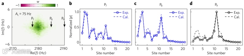 图3 (a)数值计算一维无序声子晶体在复能量平面上的缠绕数[(AL, AR)=(75 Hz, 0 Hz)],晶格尺寸N=2001,计算结果对50个无序组合取平均。(b-d)实验测量和数值计算(a)图中(b)P7(2178 Hz),(c)P8(2185 Hz)和(d)P9点(2190 Hz)的声压幅值场分布。