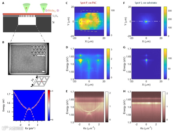 该研究中,研究团队设计并制备了悬浮的Si3N4二维光子晶体阵列,并转移高质量、大面积(毫米量级)MoSe2单层材料,构建激子极化激元体系。通过空间/动量分辨荧光成像,发现相比平面基底上激子仅限于2 µm以内的局域发光,光子晶体上的极化激元可传播超过20 µm,展现出数量级的提升。