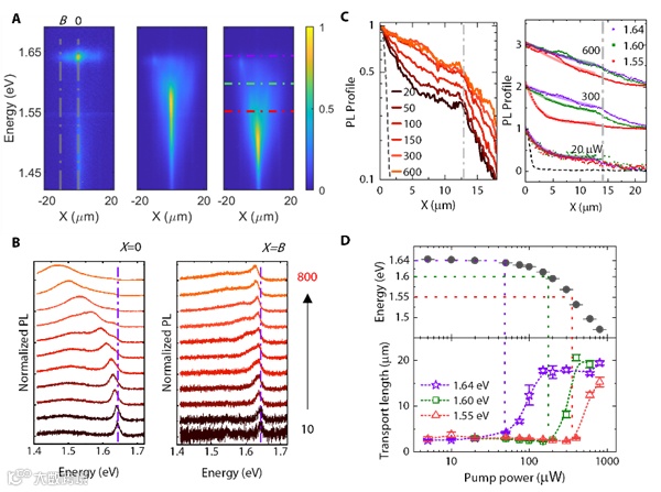 研究进一步揭示了色散和泵浦功率对输运特性的调控。通过比较三种不同晶格周期下形成的极化激元色散结构,发现其输运行为受极化激元色散与弛豫路径控制。而且,在提升泵浦功率时,观察到激子向极化激元的受激弛豫过程,伴随发射能量的红移和传播长度的非线性变化,表明在高激发下极化激元态将主导输运行为,为未来发展极化激元超流与非线性输运提供可能。