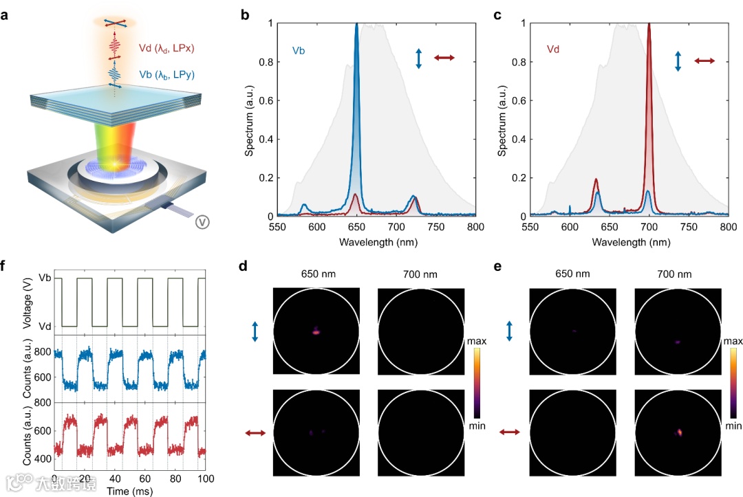 最后,研究团队将上述设计的复合量子超构表面集成到MEMS微腔平台中,验证了在同一器件上实现宽光谱范围的调谐以及偏振态的动态切换。通过调节驱动电压,QEMS–MEMS光子源的发射峰波长可在650 nm至700 nm的范围内调节;同时,由于不同波段的光子分别携带不同的偏振,因而,该设计同时实现了所发射光子的波长和偏振态的动态切换。实验证明两个态的动态可调的响应时间在亚毫秒级别,展示出优异的动态响应性能,通过采用更先进的微机电系统设计,有望将切换速度进一步提高到微秒量级,从而满足更高速的光子器件调控需求。