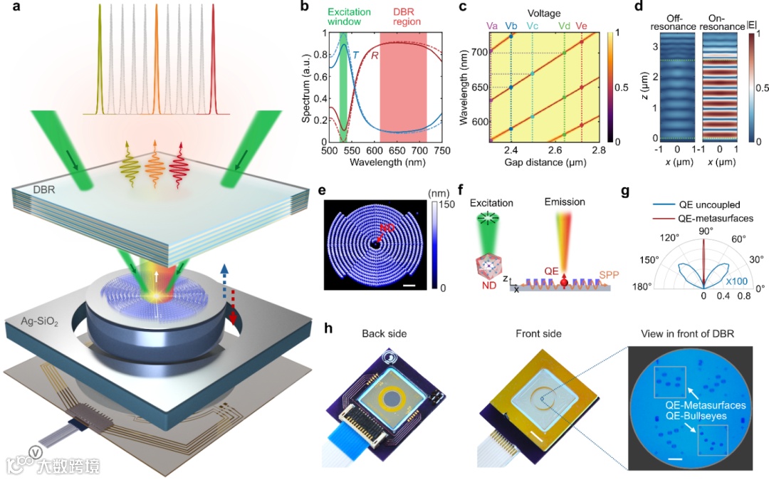 在最新的工作中,研究者提出了一种名为“MEMS-QEMS”的动态光子源架构:在量子发射周围加工精密设计的超构表面,再将之嵌入可调谐Fabry–Pérot微腔中,通过微机电系统实现动态调谐。微腔由一个高反射分布式布拉格反射镜(DBR)和一个可移动的MEMS反射镜组成。特别设计的布拉格反射镜(DBR)在532 nm激发光波段具有高透射率,而在纳米金刚石氮空位(NV)色心的发射波段具有高反射率(注:532 nm预留为激发窗口,625–725 nm覆盖NV色心室温发光主波段)。这种设计确保激发激光可以有效透射进入腔体,而腔内的自发辐射光则被DBR高度反射,从而在微腔内形成光学谐振。通过在MEMS薄膜上施加电压,能够精确控制腔长(即DBR与MEMS反射镜之间的间隔),从而调节微腔的谐振波长。这一设计利用电控方式动态改变腔模态,将传统静态光子器件“活化”为可实时调谐。值得一提的是,QEMS中的微纳结构将固态发射器激发产生的表面等离激元转换为高度准直的聚集光束,这有助于将光子更高效地耦合进入腔体。有效克服了未耦合超构表面的量子发射器存在的全向发射的问题。因此,与需要曲面反射镜收集光的常规设计不同,该芯片集成光子器件无需抛物面镜和大型定位组件,体积小巧,有利于应用于未来集成光子系统。