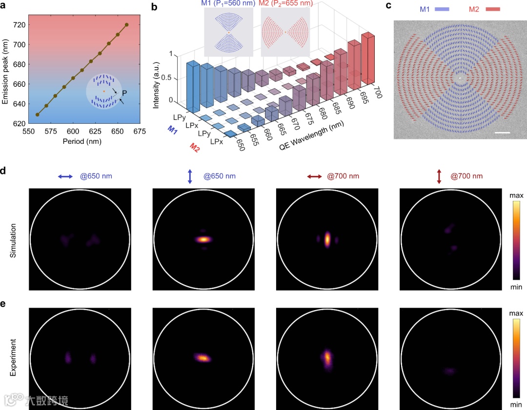 为了进一步展示该平台的功能多样性,研究者设计了复合量子超构表面,以实现多波长-偏振的复用发射。在以往的工作中,量子超构表面的设计通常针对单一特定波长展开。如果能使光子器件同时调控多发射波段,并让不同波段对应不同偏振态,将为光子源提供更多维度的信息编码能力。研究人员巧妙地将超构表面划分为不同区域,在各个区域内分别布置具有不同周期的微纳结构阵列,设计了两个子超构表面,使不同区域的结构分别对应不同的目标发射波长和偏振。围绕同一个预选的纳米金刚石,集成该复合量子超构表面,实现了:650纳米波长的光子由垂直偏振态主导,而700纳米波长的光子由水平偏振态主导,即为波长与偏振的空间解耦复用提供可能。
