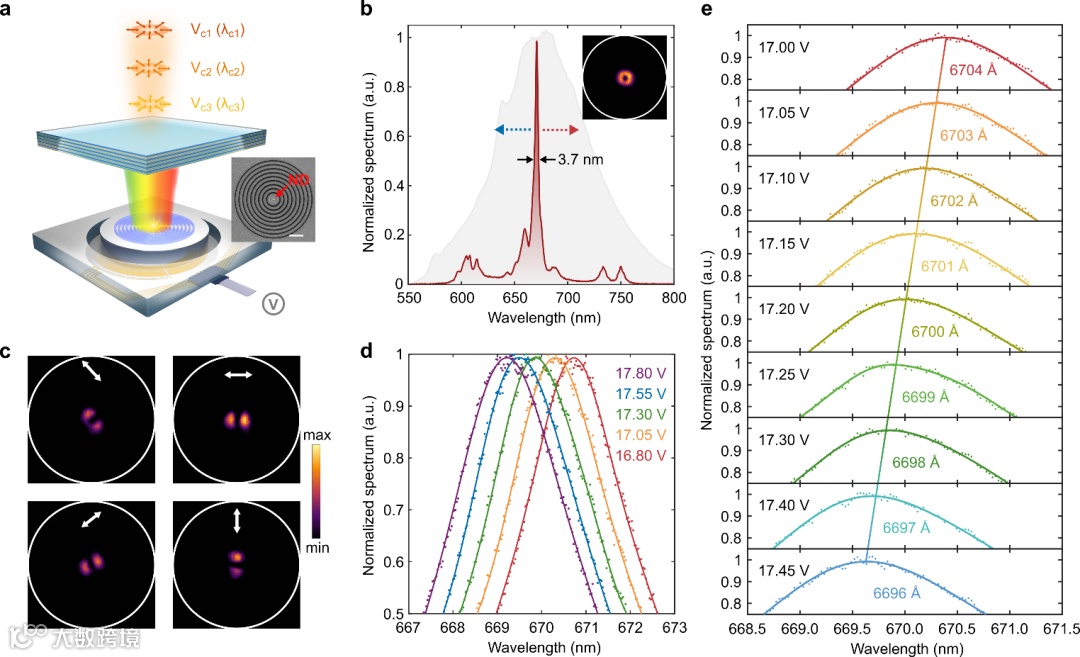 利用上述MEMS–QEMS平台,研究团队首先构建了同心环(Bullseye)结构耦合纳米金刚石色心,并将其集成在微机电系统控制的腔体中。在室温下,含有氮空位中心的纳米金刚石通常具有宽发射线宽(约100纳米),而集成后的光子发射器的线宽为3.7纳米(品质因子约180)。其所发射光子束的光斑呈现环状,通过旋转线偏振片证实了其径向偏振的属性。改变施加的电压,可以精准调控腔体长度,从而改变腔体响应频率,继而实现对光子发射器发射波长的控制,实验证实了光谱控制精度达到埃米级(约每 50 mV产生 0.8 Å 波长偏移)。