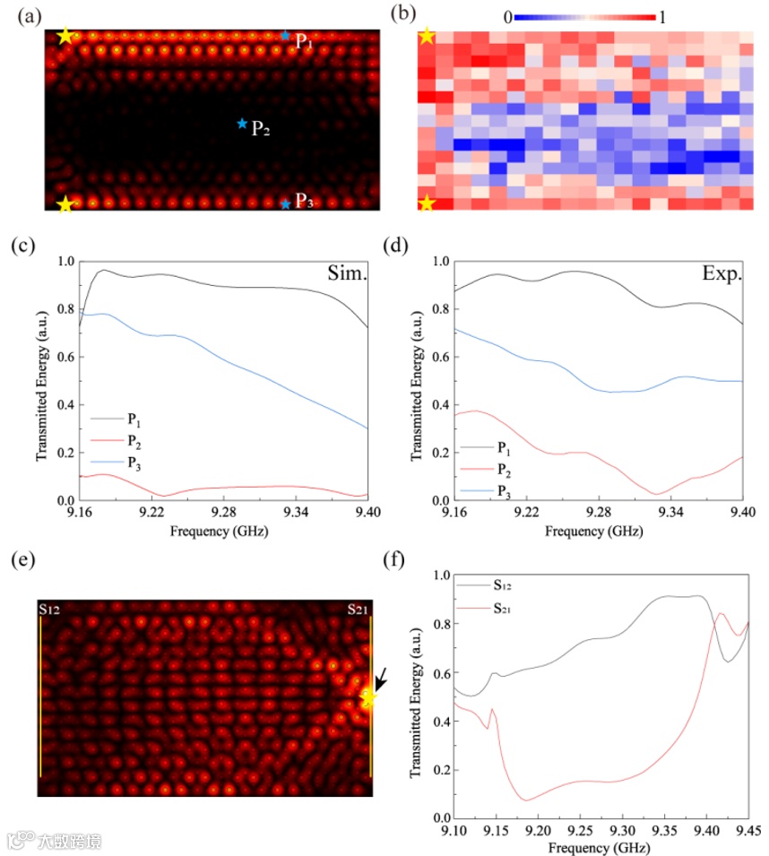 图5.(a)与(b):分别为 9.18 GHz 和 9.2 GHz 频率下,反手性边界态的电场分布(左图为数值模拟结果,右图为实验测量结果)。(c)与(d):P1、P2、P3 三个探测点处的传输光谱。(e):由黑色箭头标记的激励源激发的体态电场分布图。(f):体态的 S21 与 S12 传输系数图。