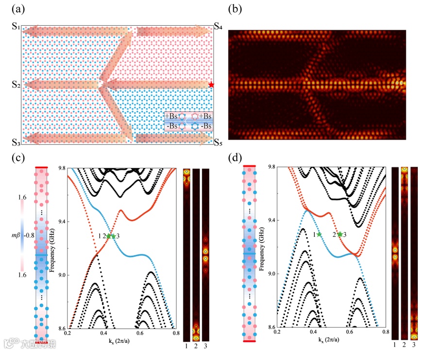 图6.(a)由四种旋磁光子晶体(GPC)结构组成的五通道单向波导示意图:该波导工作于真实磁场(B₀)与赝磁场(Bₛ)的相互作用下。图中红色星号标记激励源位置,红色箭头标记电磁波的传输通道。(b)9.34 GHz 频率下,手性边界态与反手性边界态的电场分布。(c)当晶格层数为 7、 β=0.4 mm 时,两种具有相反赝磁场(Bₛ)方向的旋磁光子晶体的手性边界态色散关系图。上边界态与下边界态用红色线表示,中间通道用蓝色线表示。(d)两种具有相反赝磁场(Bₛ)方向的旋磁光子晶体的反手性边界态色散关系图。