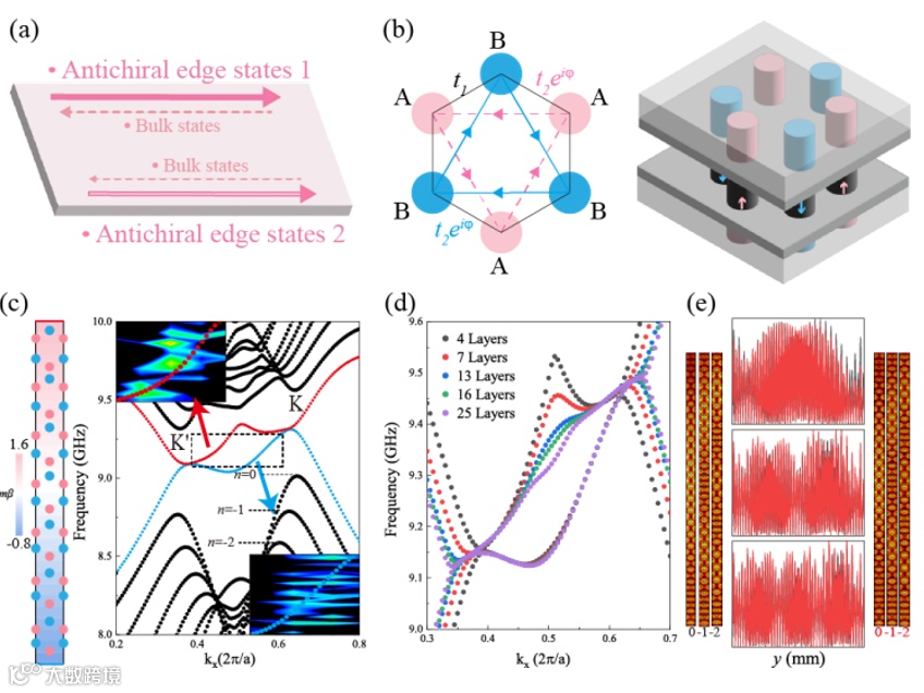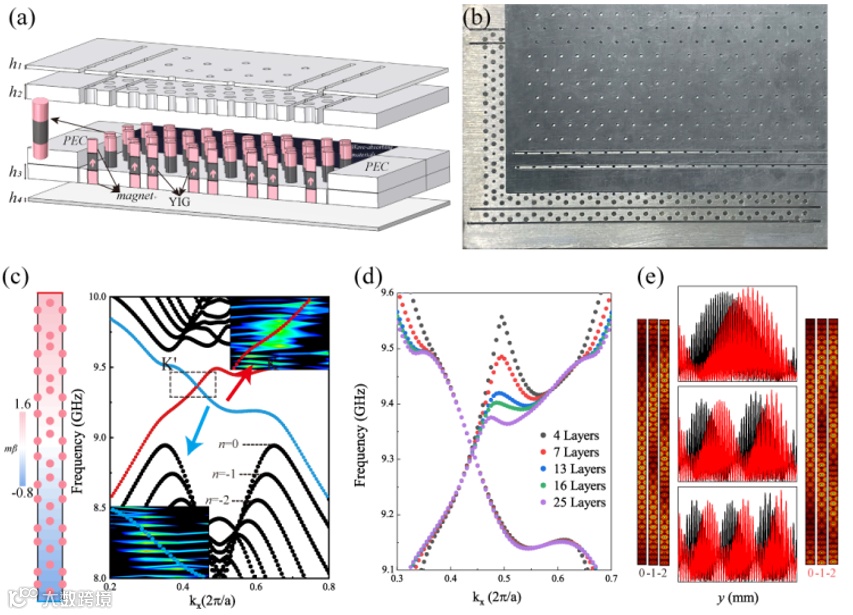 图2.(a)赝磁场下观察手性边界态的实验装置示意图:半径 1.5 mm、高度 5 mm 的旋磁柱体置于由平行铝板构成的波导内;在旋磁柱体正上方与正下方放置半径 1.5 mm、高度 0.5 mm 的永磁体,以提供均匀的外部真实磁场。(b)实验装置俯视图:晶格发生形变,共 7 层,对应形变量 β 为 0.4 mm。(c)手性边界态的形变能带色散关系:图中数据分别来自数值模拟与实验测量,其中上边界态用红色线表示,下边界态用蓝色线表示。(d)不同赝磁场强度下的边界态色散关系(数值模拟结果)。(e)左图:K' 能谷处 n=0、-1、-2 朗道能级的