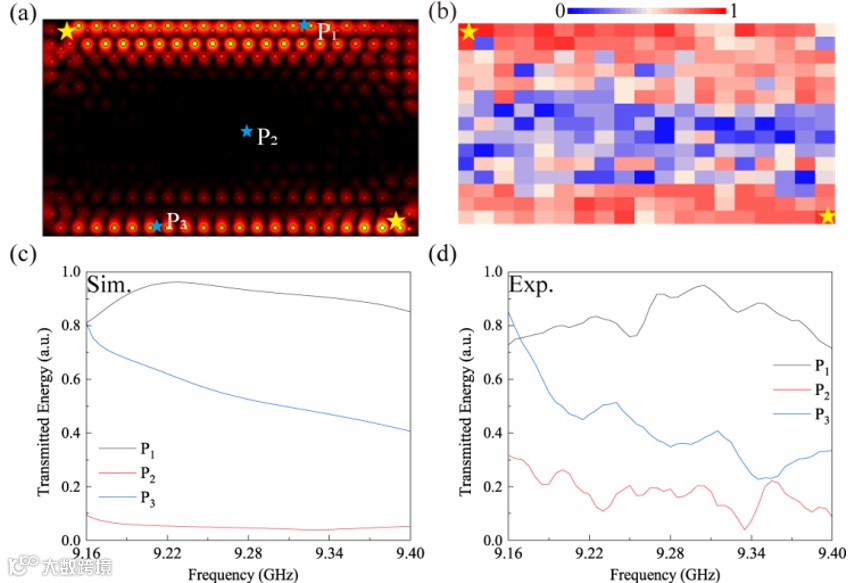 图3.(a)与(b):边界态非均衡传输的电场分布(分别为数值模拟结果与实验测量结果)。在 9.25 GHz 频率下,上边界的电场强度高于下边界。(c)与(d):传输光谱(分别为数值模拟结果与实验测量结果)。