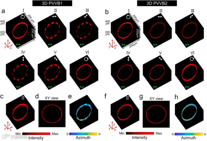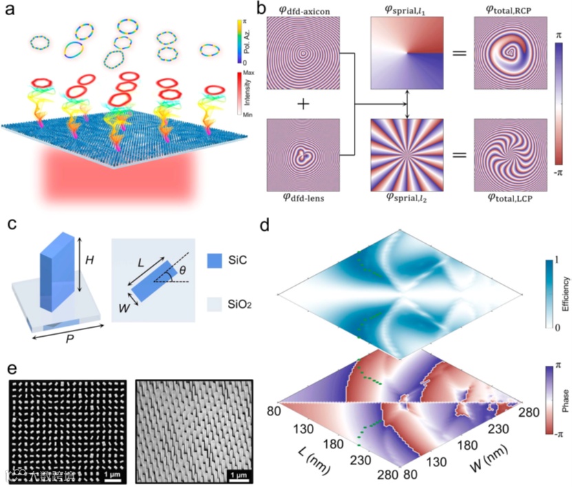 为此,研究团队提出了一种基于单片超构表面光学器件生成任意三维完美矢量涡旋光束的方法,这种光束具备定制化的三维空间强度分布,且与携带的拓扑荷数或偏振级数无关(图1a)。利用复合相位调制方法,设计单片偏振复用超构表面器件提供两种不同的相位分布(图1b),其可以直接实现两个正交圆偏振的三维完美涡旋光束的同轴叠加,无需振幅调制以及其它额外的光学元件。超构表面器件的结构单元由一系列高度相同的碳化硅矩形纳米柱组成(图1c),它们具有较高的正交偏振转换效率并且能够覆盖0-2π的相位范围(图1d)。采用半导体工艺兼容的方法,制备了低损耗的碳化硅超构表面器件(图1e),实验产生了具有几乎相同空间轨迹但不同偏振分布的两种三维矢量涡旋光束(图2),从而验证了这种光束的“完美”特性。