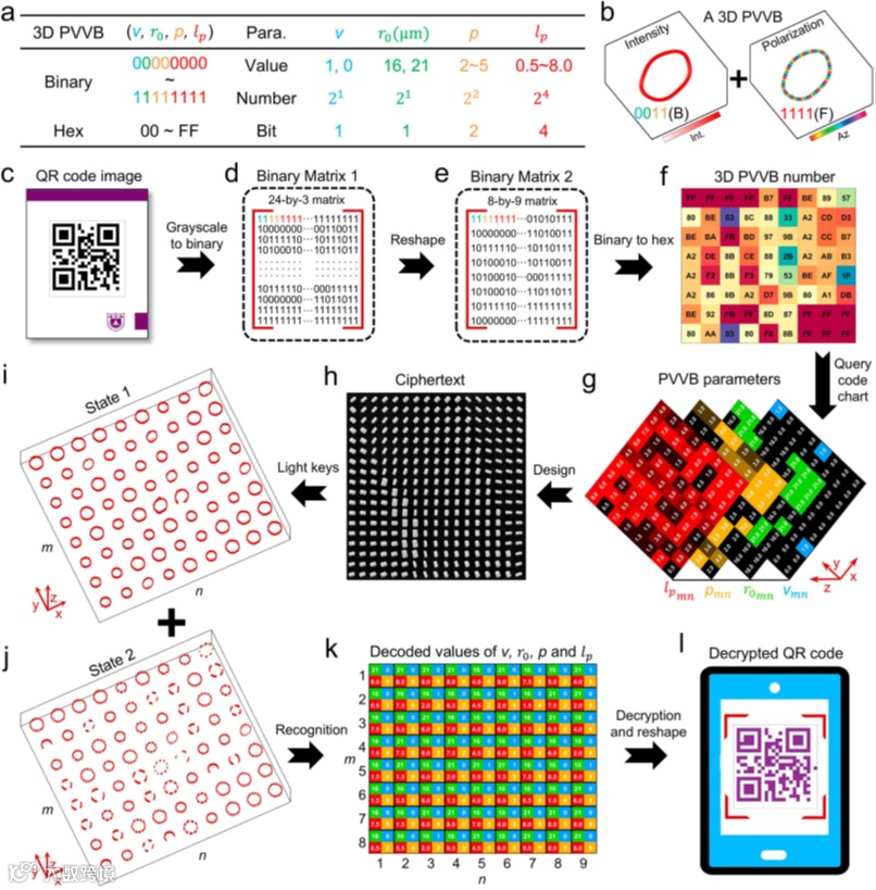 此外,利用三维完美矢量涡旋光束的多个自由度,通过单片超构表面器件生成了一系列三维完美矢量涡旋光束并用于信息编码,展示了一种增强安全性的信息加密方案(图3),可用于光学防伪领域。