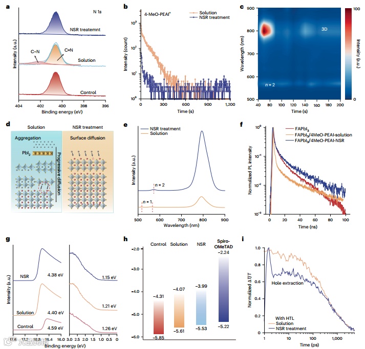 作者详细分析了NSR处理的 2D 钙钛矿的光电性能。通过XPS分析 N 1s 区域,发现在溶液处理的钙钛矿薄膜中出现了归因于铵配体与块体钙钛矿相互作用的C–N信号,表明铵配体在溶剂的辅助下会渐进扩散到块体内部。然而,在 NSR处理的薄膜中,该信号并未出现,这证明在NSR过程中钝化分子不会随溶剂扩散。TOF-SIMS进一步证实,NSR方法中铵配体更局限于表面,渗透程度远低于溶液处理样品。NSR处理的钙钛矿薄膜展现出更强的光致发光强度和更长的光致发光衰减时间,这有效地抑制了表面陷阱态相关的非辐射复合。UPS测量结果表明,NSR 方法导致费米能级(EF)更显著的向上移动(从-4.59 eV到-4.38 eV),同时价带最大值(VBM)也略有提升(从-5.85 eV到-5.53 eV),这表明界面能级对齐得到改善,有利于空穴提取。TTRPL测量也一致证实,NSR处理的薄膜具有加速的空穴转移、改进的界面电荷动力学、抑制的界面复合以及减少的载流子积累。这些结果共同证明了NSR策略在优化钙钛矿薄膜光电性能方面的卓越能力。
