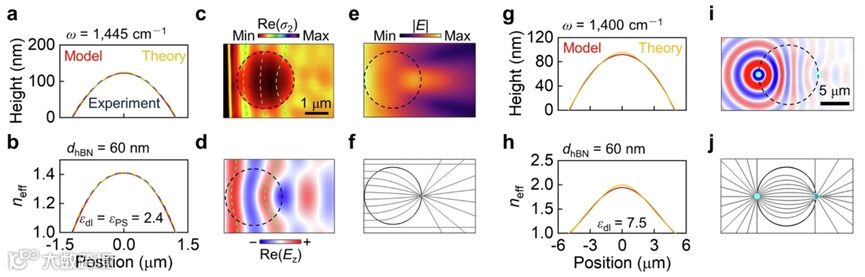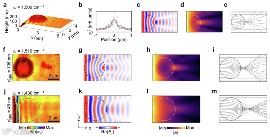 利用散射式扫描近场光学显微镜(s-SNOM),团队观测到了基于六方氮化硼(hBN)的Luneburg透镜中极化激元的近场分布图像,得到了与仿真预测基本一致的实验现象,从而证明了该方法的有效性(图4)。