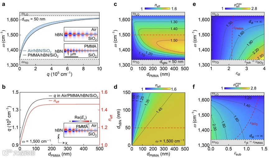 本研究首先提出了设计极化激元渐变折射率透镜的两种思路:改变极化激元材料厚度和改变介电层厚度(图1)。虽然团队前期的研究证明了通过选区刻蚀改变承载材料自身的厚度来调控极化激元波束的可行性[ACS Nano, 18, 17065 (2024)],但在约100nm厚的极化激元材料中构造渐变的厚度梯度仍具有较高的技术难度,且往往会引入额外的损耗。与之相比,改变介电层厚度避免了对极化激元承载材料的直接刻蚀,而且可以灵活地选择具有不同折射率的介电材料(图2),因而具有更高的设计自由度,但这种方法一般需要精密的灰阶电子束光刻等微纳加工手段,工艺条件较为苛刻。